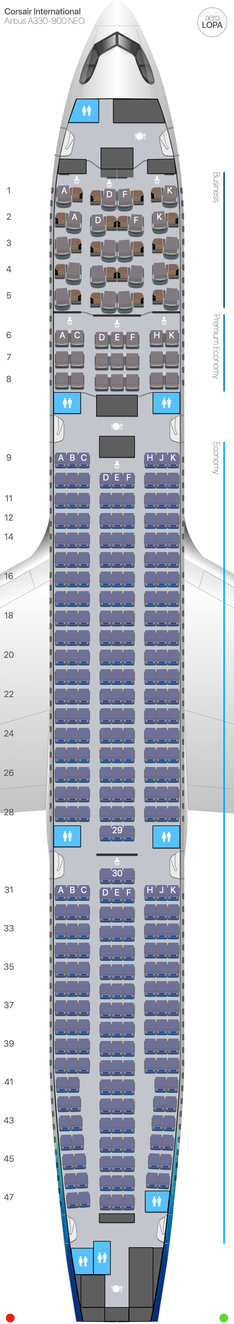 Corsair International ist ein weiterer großer Betreiber des Airbus A330-900 und verfügt über neun Exemplare dieses Typs in seiner Flotte. Die A330-900 von Corsair verfügen über 352 Sitze in drei Kabinenklassen, darunter 20 Sitze in der Business-Konfiguration in einer 1-2-1-Anordnung, 21 in der Premium Economy in einer 2-3-2-Anordnung und 311 in der Economy in einer 3-3-3-Anordnung. Die Business Class bietet Stella Opal-Flachbettsitze und ein kleines Seitendeck mit viel Stauraum.