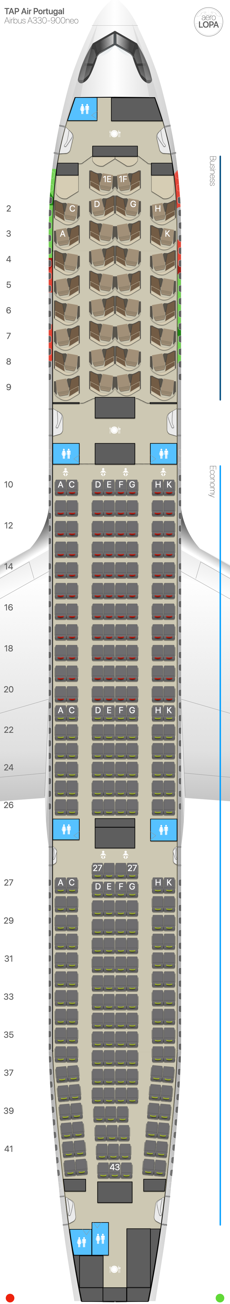 TAP Air Portugal betreibt eine starke Flotte von 19 Airbus A330-900, zwei weitere sind bestellt. Die A330-900 der Fluggesellschaften verfügen über 298 Sitze in drei Kabinenklassen, darunter 34 Sitze in der Business-Reihe in einer 1-2-1-Anordnung, 96 in der Economy Xtra in einer 2-4-2-Anordnung und 168 in der Economy in einer 2-4-2-Anordnung.