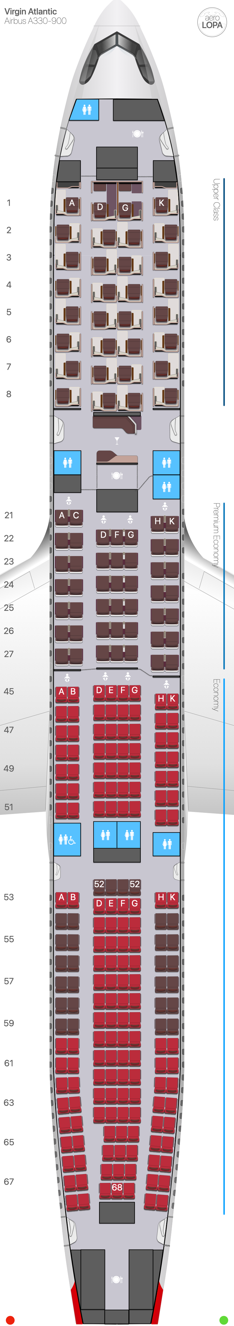 Eine weitere Fluggesellschaft, die den Airbus A330-900 betreibt, ist die größte britische Fluggesellschaft Virgin Atlantic, die über eine Flotte von acht A330-900 verfügt. Daten von ch-Aviation zeigen, dass die Fluggesellschaft auf 16 weitere Exemplare dieses Typs wartet. Die A330-900 von Virgin Atlantic sind mit 262 Sitzen in drei Kabinenklassen ausgestattet, darunter 32 Sitze in der Oberklasse in einer 1-2-1-Anordnung, 46 in der Premium-Konfiguration in 2-3-2 und 184 in der Economy-Klasse in einer 2-4-2-Anordnung.