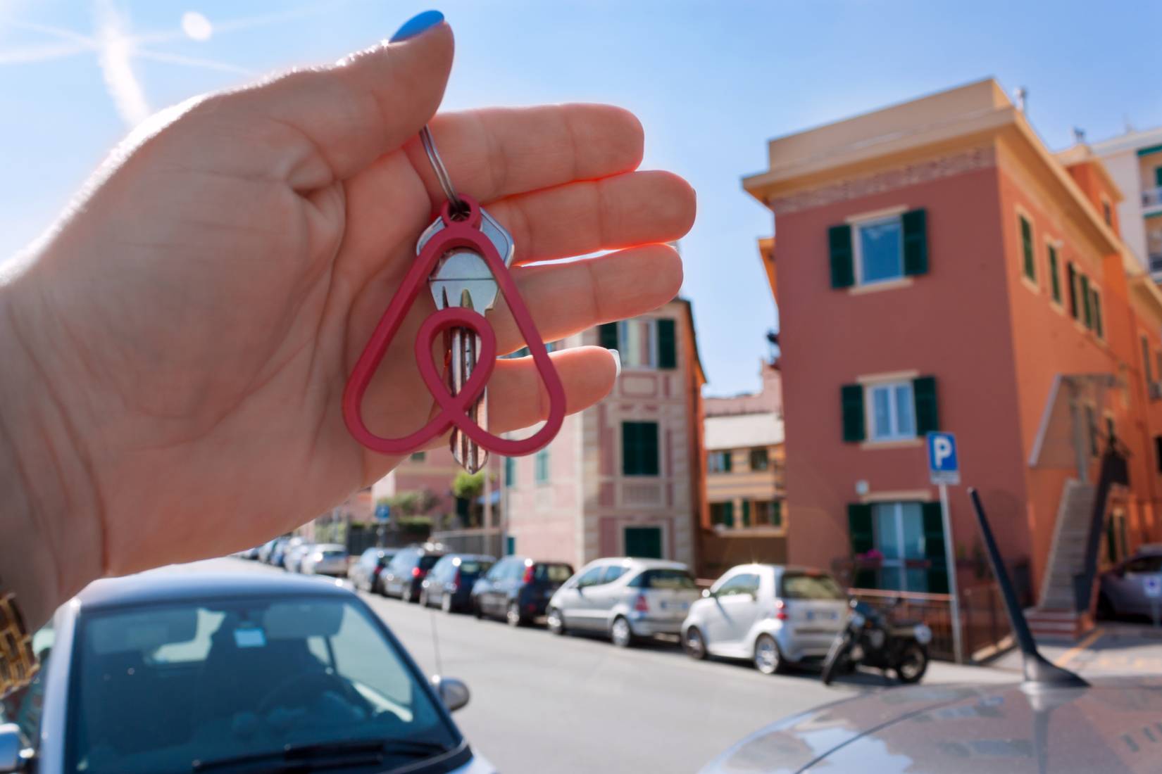 Eine Person hält den Schlüssel mit dem Logo eines beliebten Unternehmens, Airbnb.Quelle: Shutterstock