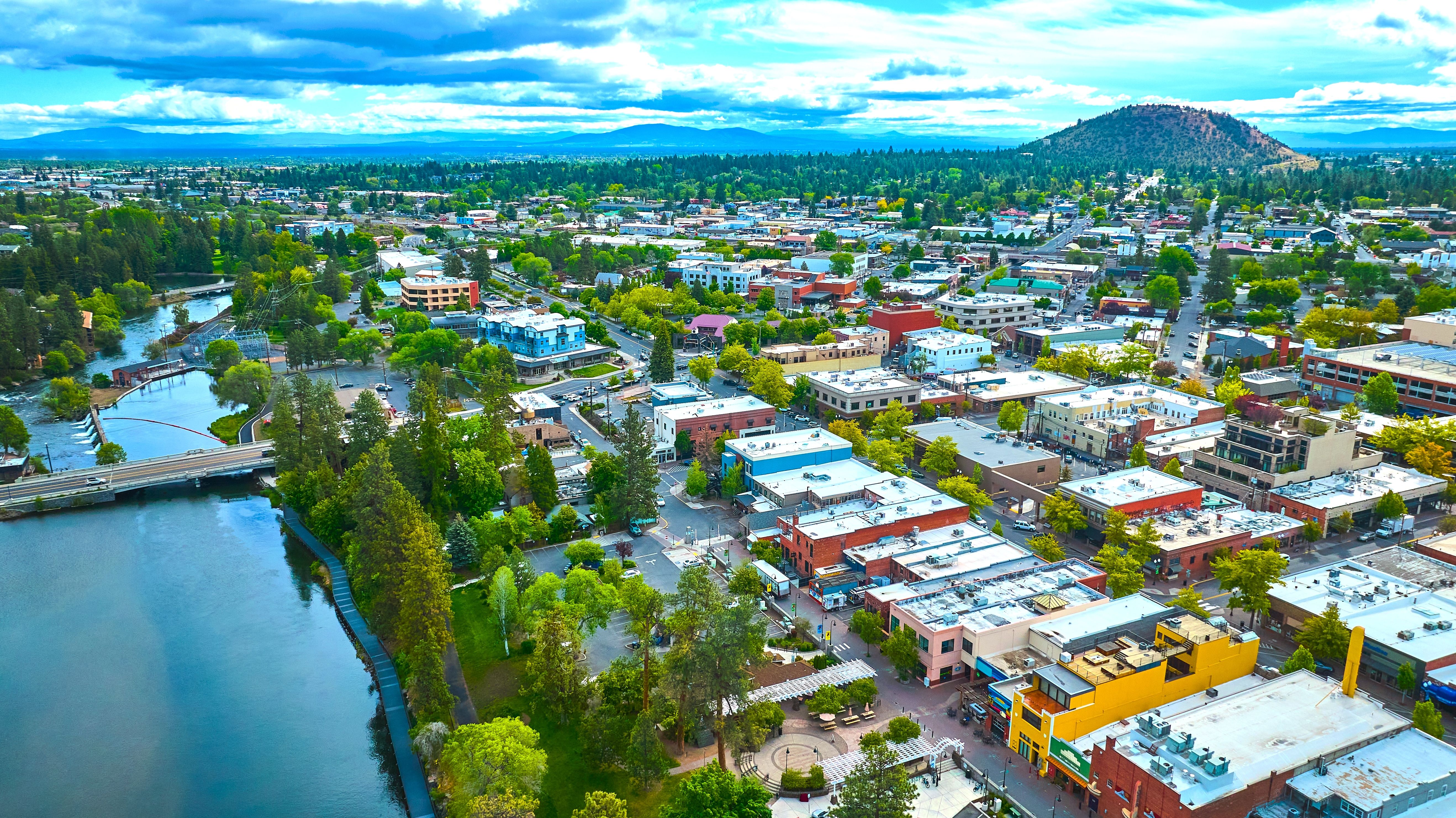 Eine Luftaufnahme der Innenstadt von Bend, Oregon.