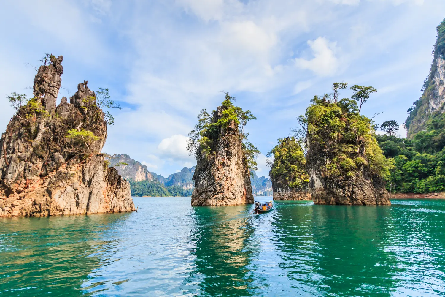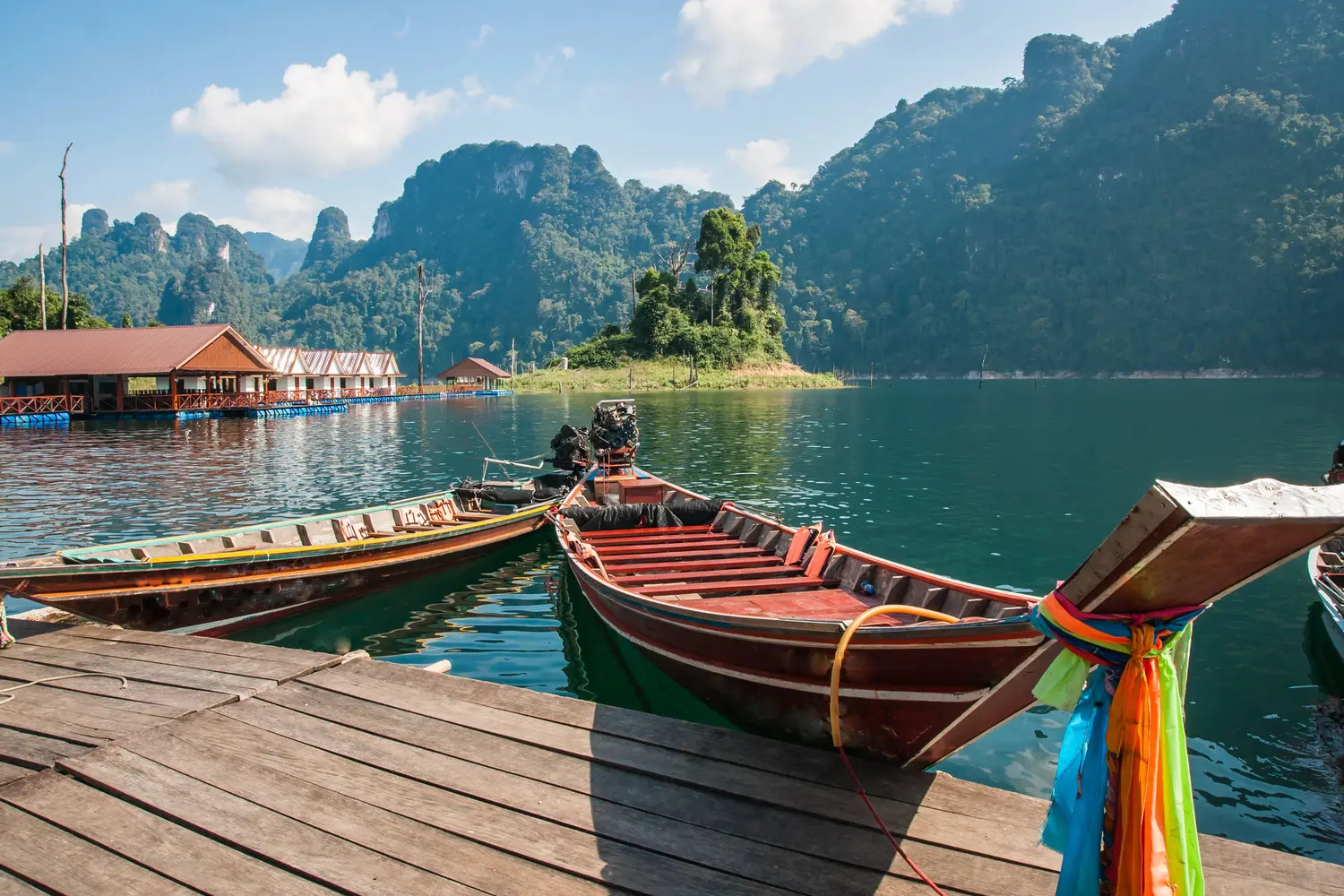 Eine Longtail-Bootstour auf dem Cheow-Larn-See ist mit Abstand die beliebteste Tour im Park. Abgesehen von der Übernachtung in einem der schwimmenden Bungalows ist eine Bootstour durch den Khao Sok-Nationalpark die beste Möglichkeit, das klassische Gelände des Parks zu erleben, da die schroffen Berge mit weißen Säulen im Kontrast zum ruhigen blauen Wasser stehen und einen atemberaubenden Anblick schaffen, der zu einer viralen Sensation geworden ist.