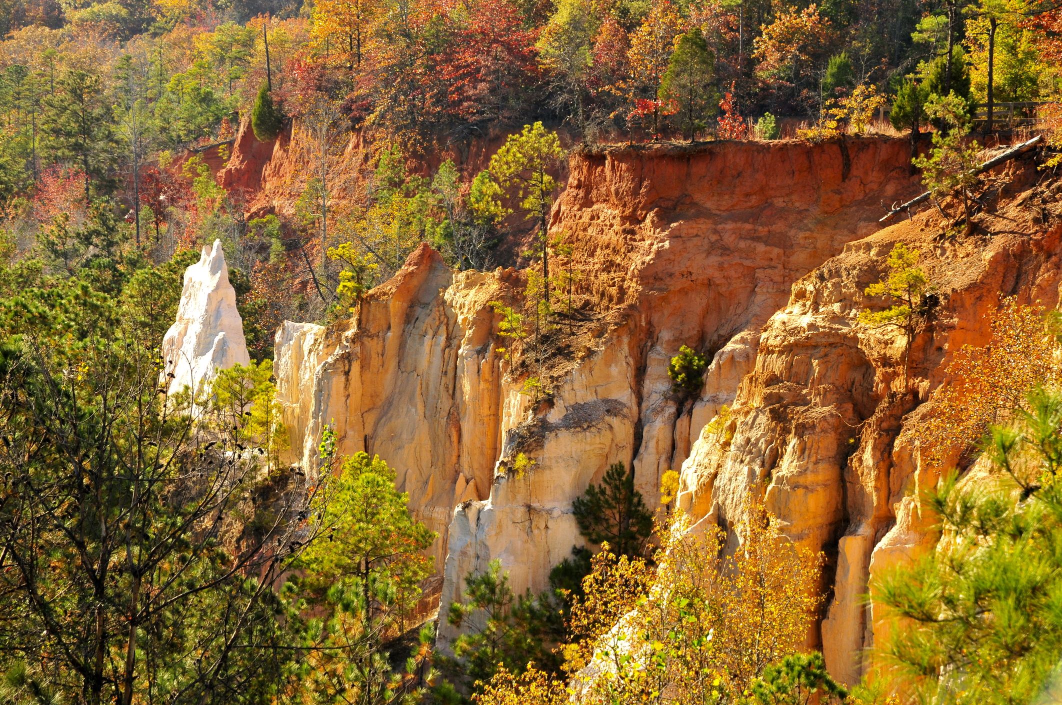 Auch der Providence Canyon State Park leuchtet im Herbst magisch. Die Wände des Canyons sehen bezaubernd aus, wenn die wechselnden Blätter ein Flickenteppich aus Gelb-, Gold-, Rot- und Orangetönen bilden und den Park in ein Herbstwunderland verwandeln.