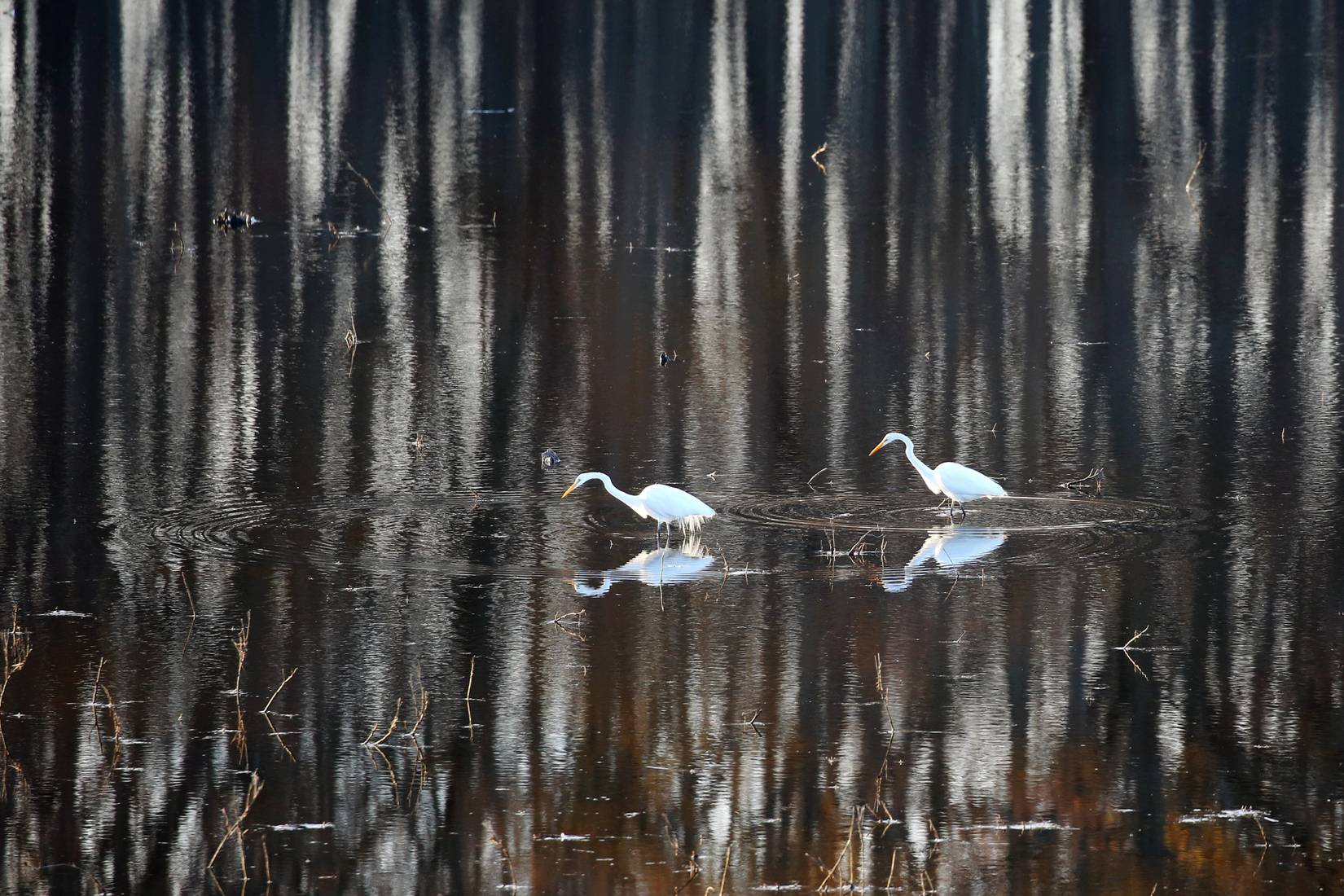 Zwei Silberreiher waten im seichten Wasser des Bombay Hook National Wildlife Refuge, Delaware, mit der Spiegelung eines WaldesBildnachweis: Davidshenbo / Dreamstime