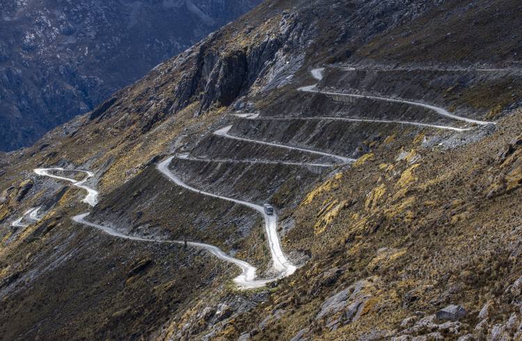 Ein Bus auf einer kurvenreichen Straße in der Region Cordillera Blanca in Peru. Bildnachweis: Getty Images / Ignacio Palacios
