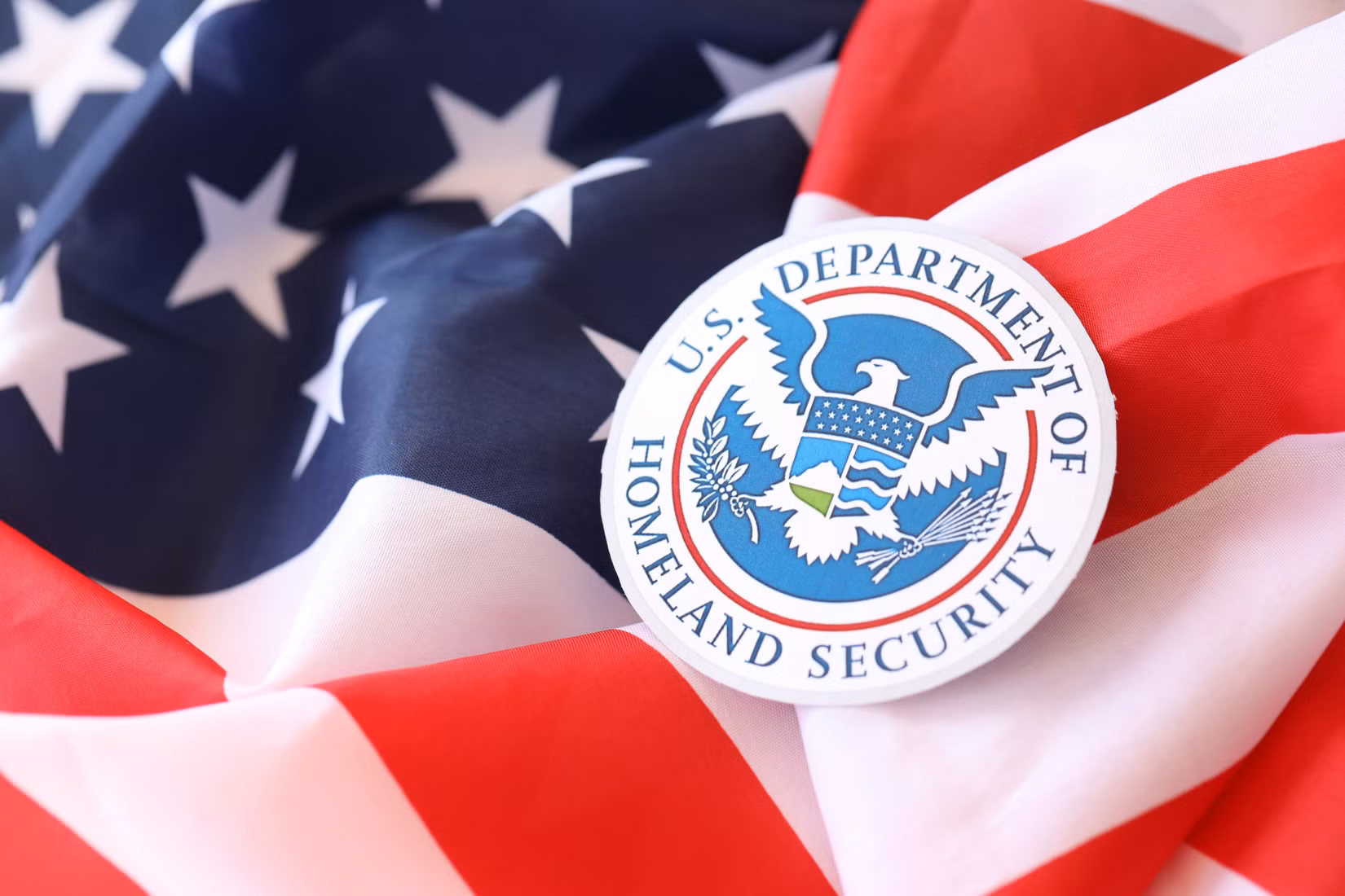 Siegel des US-Heimatschutzministeriums auf der Flagge der Vereinigten Staaten von AmerikaBildnachweis: Mehaniq / Shutterstock