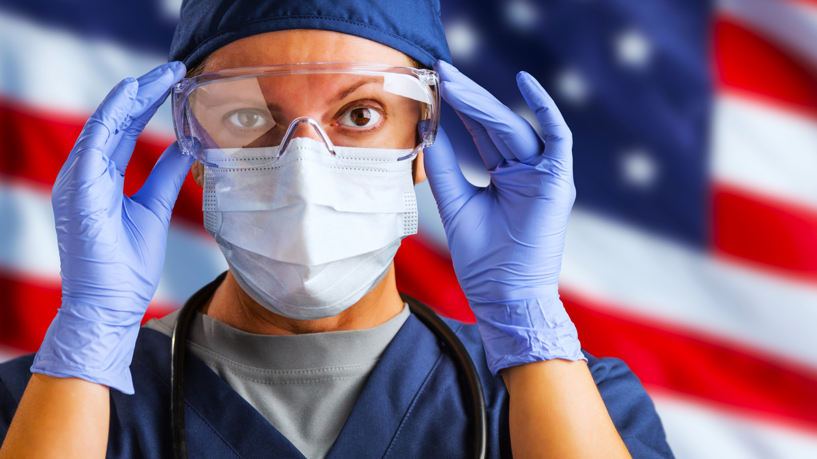 Eine Krankenschwester steht vor einer US -Flagge, während sie eine Maske und PSA trägt