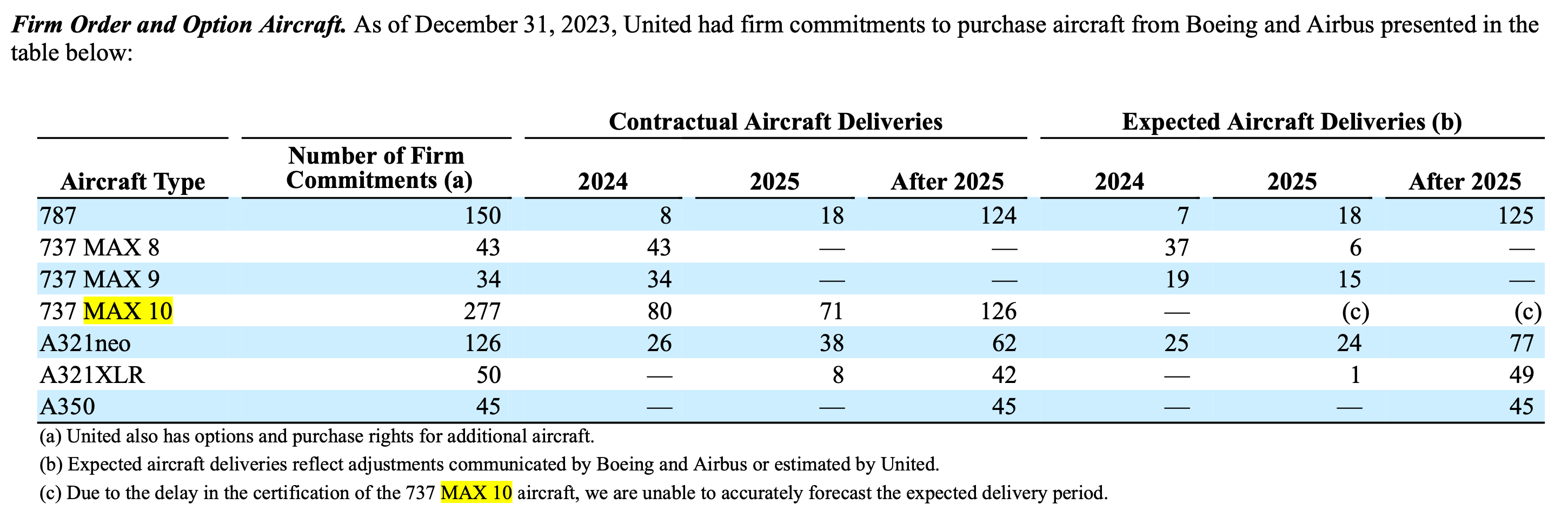 Zwischen 2024 und 2025 sollte United mehr als die Hälfte seines MAX 10 -Auftrags erhalten. Obwohl die 10-K-Anmeldung besagt, dass United in den kommenden Jahren keine maximalen 10er erwartet, gab die Fluggesellschaft angegeben.