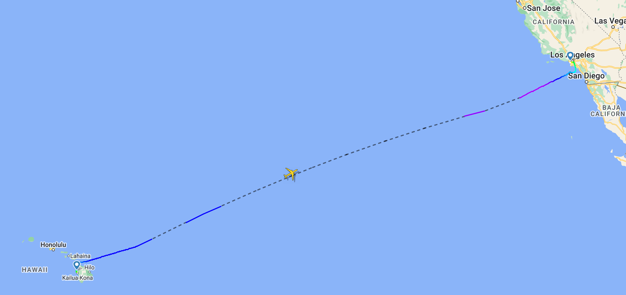 Das Flugzeug startete am 27. Februar kurz nach 11:00 Uhr von LAX. Die fünf und eine Bit-Stunde-Reise nach Kona sah es gegen 14:30 Uhr ankam, aber es war nicht, lange auf der Paradise-Insel anzuhalten. Am nächsten Tag verließ es Kona um 09:00 Uhr und kam gegen 15:30 Uhr zurück in LAX.
