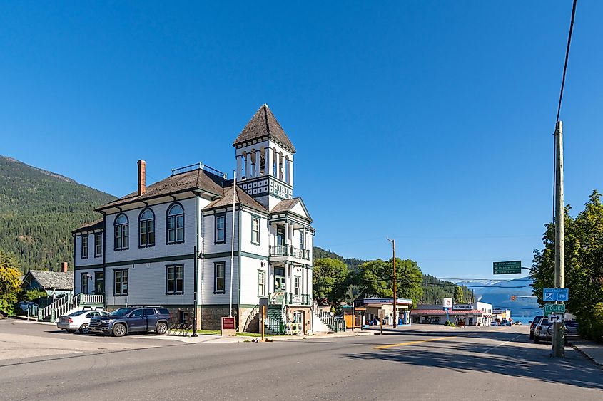 Gesamtansicht des Kaslo City Hall-Gebäudes, das 1898 in der ländlichen Holzfällerstadt Kaslo, British Columbia, errichtet wurde, über Kirk Fisher / Shutterstock.com