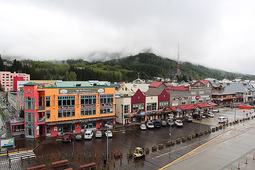 Die Geschäfte am Wasser in Ketchikan, Alaska.