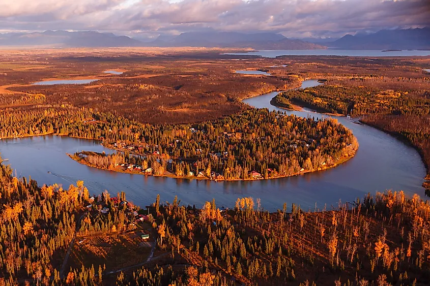Luftaufnahme der Herbstfärbung entlang des Kenai River auf der Kenai-Halbinsel in Alaska.
