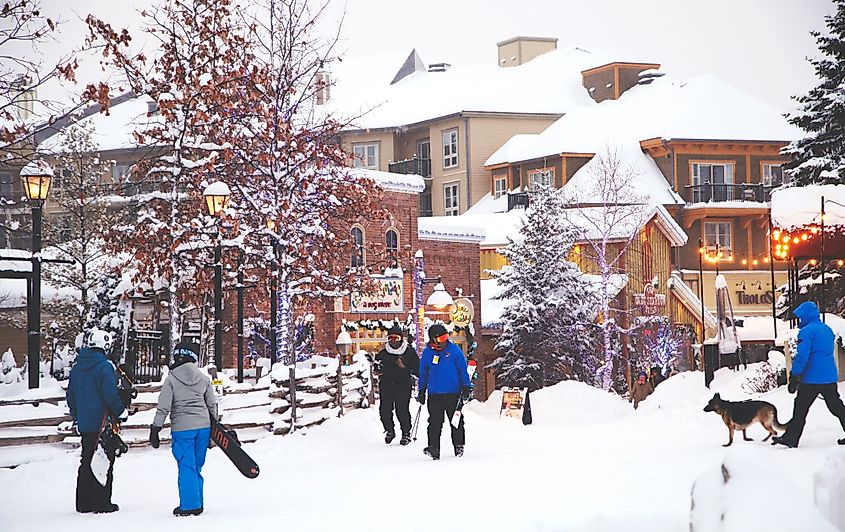 Blue Mountain Village an einem verschneiten Wintertag in Collingwood, Ontario, Kanada. Bildnachweis: AnjelikaGr / Shutterstock.com
