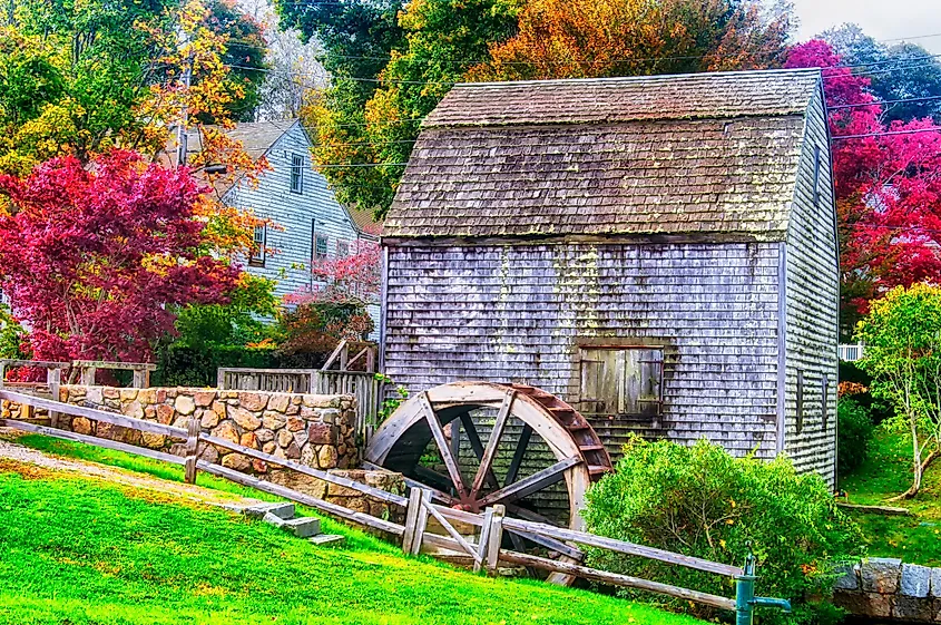 Dexter Grist Mill und Wasserrad-Wahrzeichen in Sandwich, Massachusetts, Neuengland.