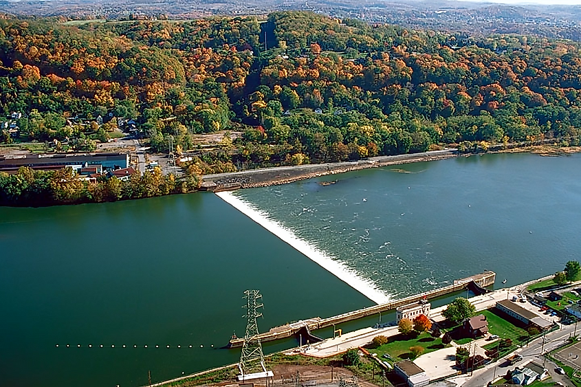 Blick auf die Schleuse und den Staudamm Nummer 4 entlang des Allegheny River in der Nähe von Brackenridge in Pennsylvania. Von U.S. Army Corps of Engineers – U.S. Army Corps of Engineers Digital Visual LibraryBildseiteBildbeschreibungsseite, Public Domain,Wikimedia Commons.