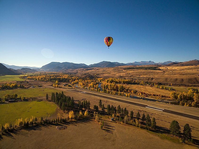 Ein Heißluftballon fliegt über Winthrop, Washington.