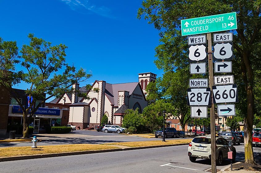 Wegweiser an der Hauptstraße von Wellsboro im Tioga County, Pennsylvania, über George Sheldon / Shutterstock.com