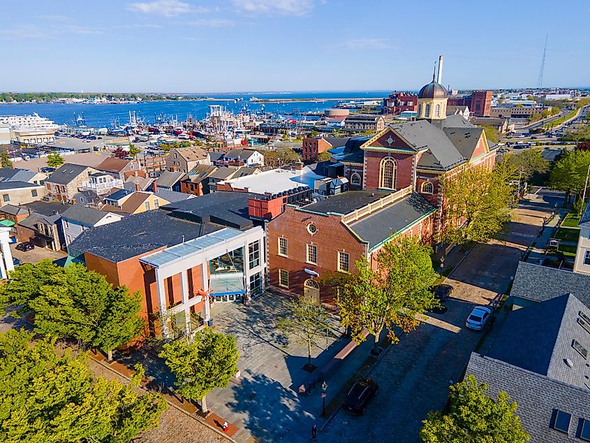 Luftaufnahme des Gebäudes des New Bedford Whaling Museum in der historischen Innenstadt von New Bedford, Massachusetts