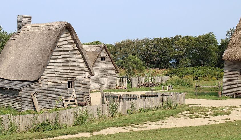 Die nachgebauten Kolonialhäuser und das Dorf aus dem 17. Jahrhundert in den Plimoth Patuxet Museums. Bildnachweis: Jaclyn Vernace / Shutterstock.com