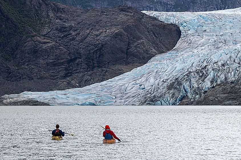 Zwei Kajakfahrer paddeln zum Mendenhall-Gletscher in Alaska. Bildnachweis: Jay Tilles / Shutterstock.com