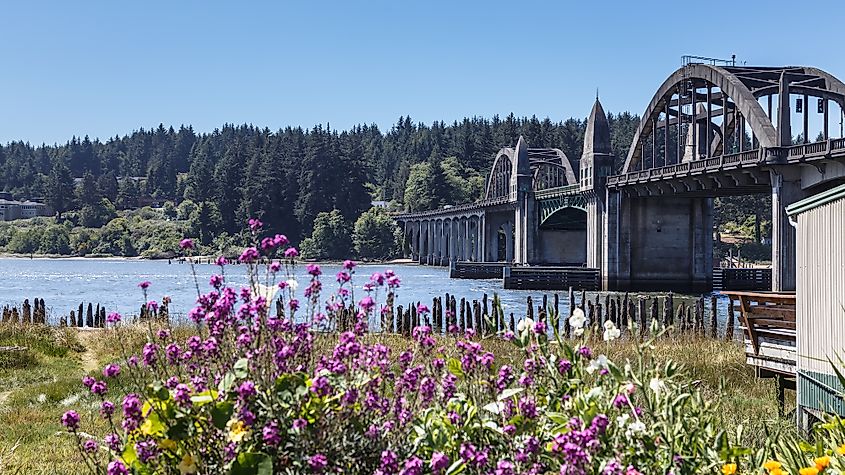 Siuslaw River Bridge und der Fluss in der historischen Altstadt von Florence, Oregon.
