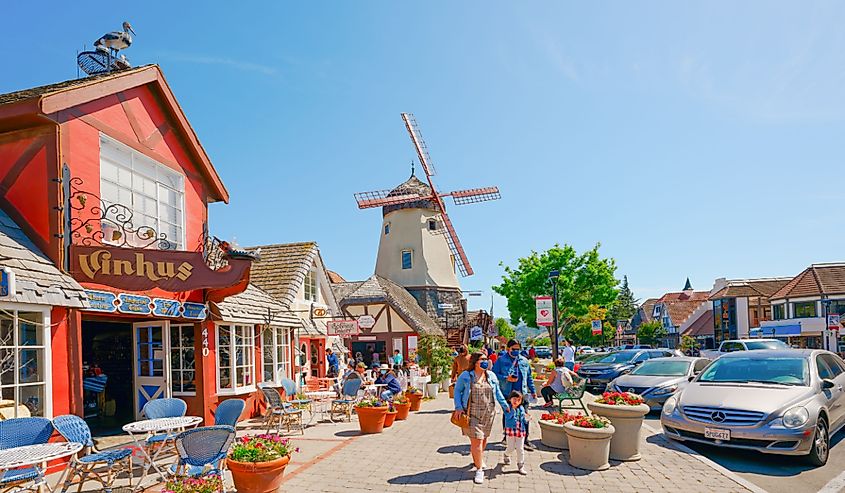 Hauptstraße, Straßenansicht und Touristen in Solvang. Bildnachweis HannaTor über Shutterstock