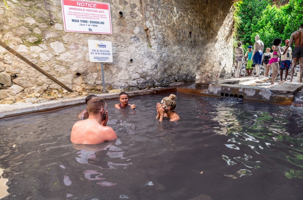 Eines der besten Dinge, die man in St. Lucia unternehmen kann, ist ein Stopp bei den heißen Schwefelquellen, die sich gegenüber dem Autovulkan südlich von Soufrière befinden. Das heiße Wasser, das in der Nähe aus der Erde entspringt, füllt einen Pool mit einer sicheren Temperatur zum Schwimmen, nicht viel heißer als ein Whirlpool, aber mit natürlichen Mineralien, die man in einem normalen Pool nicht finden würde. Beginnen Sie Ihren Besuch mit einem Stopp im Schlammbad, damit Sie den vulkanischen Schlamm auf Ihrem ganzen Körper verteilen und ihn anschließend in aller Ruhe abwaschen können.