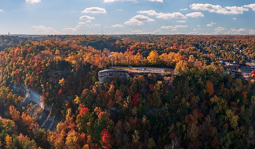 Luftaufnahme des Aussichtspunkts Lovers Leap in Hannibal, Missouri, mit leuchtenden Herbstfarben auf den Bäumen rund um die Stadt