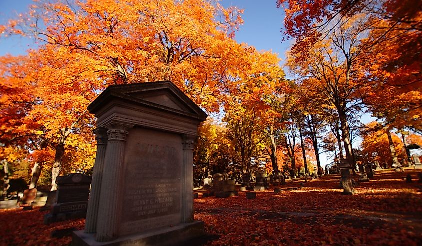 Missouri-Friedhof unter Herbstlaub. Bildnachweis Wilson Cleaver über Shutterstock.