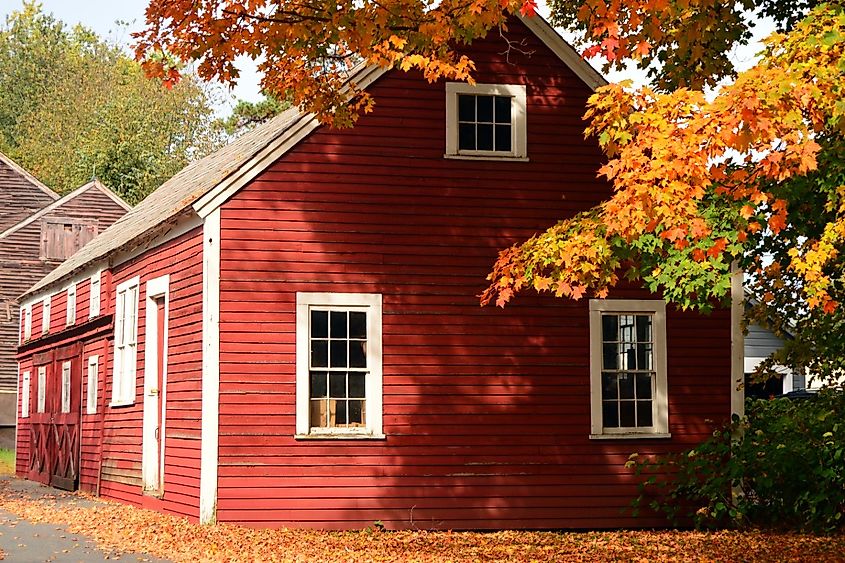 Eine rote Scheune in Chesterfield, New Hampshire. Bildnachweis James Kirkikis über Shutterstock