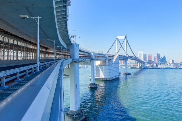 Die Regenbogenbrücke, die Shibaura Wharf und Odaiba verbindet, ist ein Symbol der Bucht von Tokio! Die Metropolitan Expressway Route 11 Daiba Line, die Port Road und die Yurikamome Line verlaufen alle über die Brücke. Sie können auch über die Regenbogenbrücke laufen.