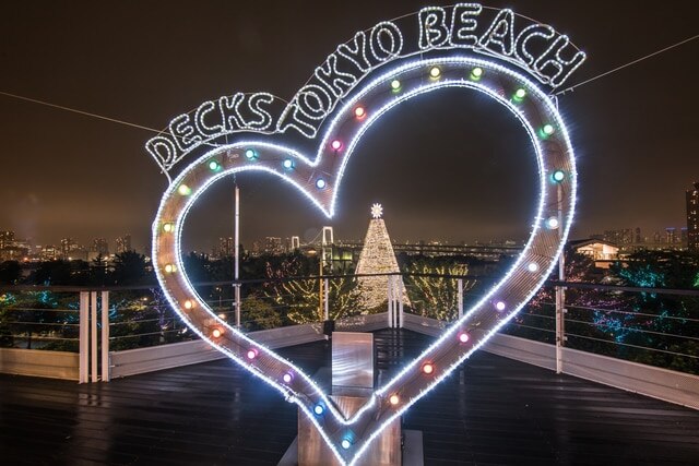 Mit dem herzförmigen Objekt, das die Nachtansicht schmückt, können Sie den Daiba-Gedenkbaum und die Regenbogenbrücke auf einem Foto festhalten. Es ist ein beliebter Ort für Paare, und wenn Sie zusammen im Herzrahmen stehen, kann dies Ihre Liebe noch mehr vertiefen.