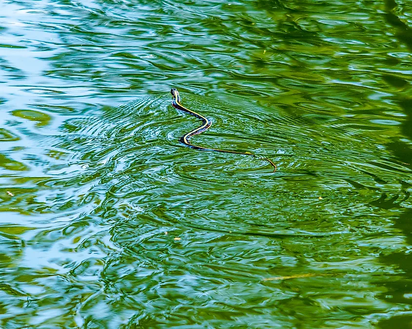 Eine gewöhnliche Strumpfbandnatter gleitet durch Wasser.