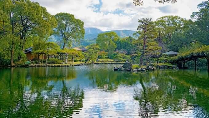 Der Höhepunkt dieses eleganten Daimyo -Gartens ist die Shirafuji Taiko -Brücke, die den Teich überspannt! Im Frühsommer blüht weiße Glyzinien auf den gewölbten Glyzahlen, die den Teich überspannen. Der Garten ist auch berühmt für die Schönheit seiner Iris und Anfang Juni, wenn sie in voller Blüte sind, wird er zu einem beliebten Ort für Touristen. Dies ist ein Daimyo -Garten, auf den Ehime stolz ist und mit vielen anderen Attraktionen gefüllt ist, wie z.