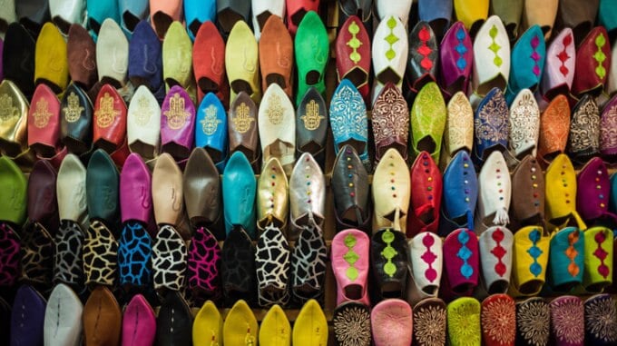 Babouche sind traditionelle marokkanische Schuhe aus Leder oder Stoff. Sie sind in leuchtenden Farben und verschiedenen Designs erhältlich, viele davon mit Stickereien, und sie werden von Kunsthandwerkern handgefertigt. Lokal werden sie oft im Freien getragen, nicht als Hausschuhe.