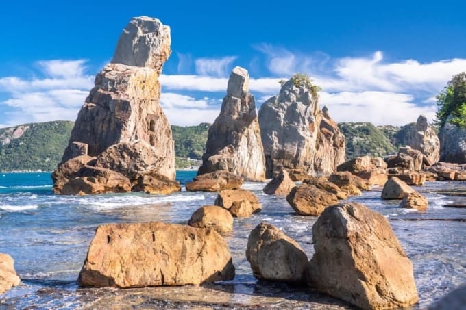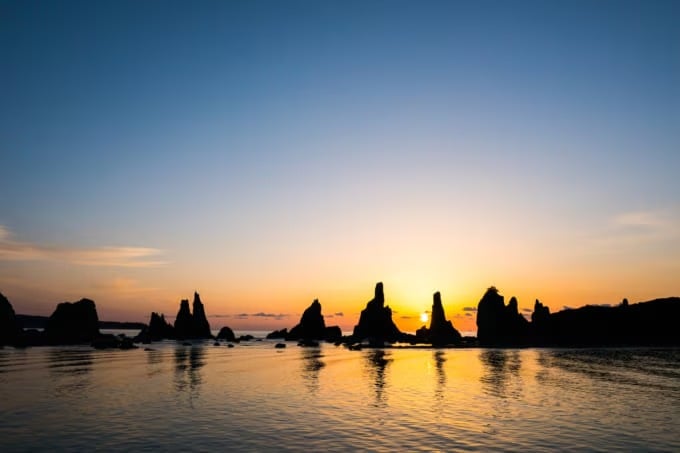 Hashiguiiwa in der Stadt Kushimoto in der Präfektur Wakayama ist ein Touristenort, an dem Sie eine Gruppe seltsam geformter Felsen mit großen und kleinen Felssäulen sehen können, die wie Brückenpfähle in einer Reihe aufgereiht sind. Die Legende von Kobo Daishi entstand aus dieser geheimnisvollen Landschaft aus etwa 40 Felsen, die über eine Strecke von etwa 850 Metern in einer geraden Linie aufgereiht sind. Der Sonnenaufgang am Morgen ist wunderschön. Wenn Sie also Hashiguiiwa besuchen möchten, empfehlen wir Ihnen, ihn früh am Morgen zu besuchen. Beliebt ist auch die zeitlich begrenzte Beleuchtung.