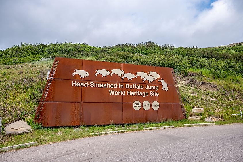 Eingangsbeschilderung für das Weltkulturerbe Head-Smashed-In Buffalo Jump in Fort Macleod, Alberta. Bildnachweis: Jeff Whyte / Shutterstock.com.