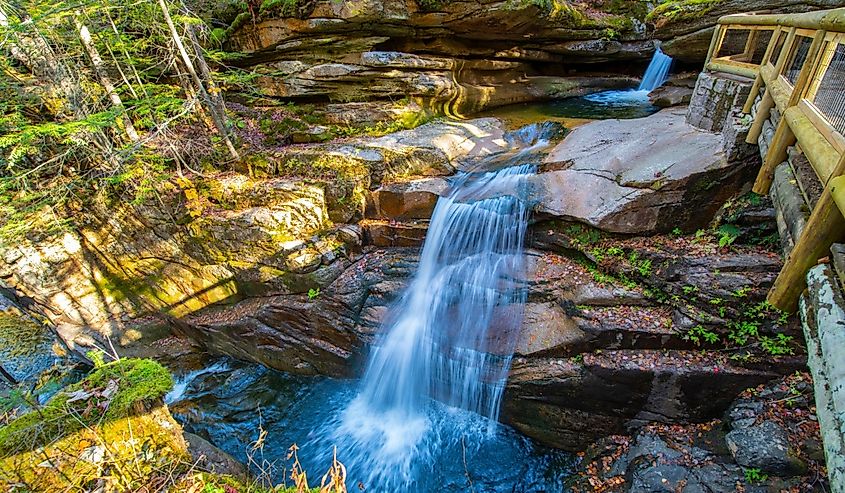 Sabbaday Falls liegt am Kancamagus Highway im White Mountain National Forest und gehört zu den optisch auffälligsten Wasserfällen des Bundesstaates. Die Wasserfälle wurden während der Eiszeit durch Gletscherschmelzwasser gebildet und verfügen über eine Reihe von Tropfen und Becken, die die Erosionskraft des Wassers über Felsen wunderschön zur Geltung bringen.