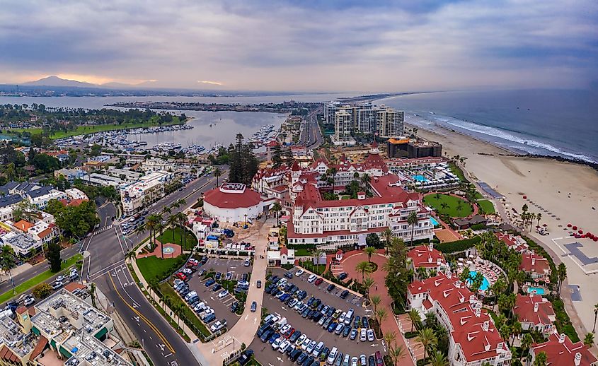 Luftaufnahme des Hotel del Coronado und anderer Gebäude in Coronado, Kalifornien.