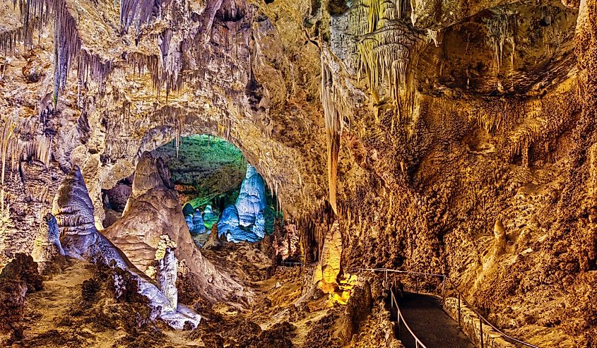 Der Carlsbad Caverns National Park enthält mehr als 119 bekannte Höhlen, die hauptsächlich durch Schwefelsäure gebildet werden, die den umgebenden Kalkstein unterirdisch auflösen. Das Herzstück ist natürlich die Carlsbad -Höhle selbst, die den großen Raum bietet, die größte Einzelhöhlenkammer in Nordamerika, die fast 4.000 Fuß lang und 255 Fuß hoch an seinem höchsten Punkt.