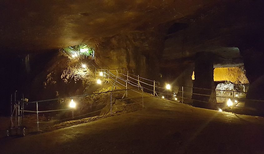 Der französische Name von Bonne Terre, der „gute Erde“ bedeutet, spiegelt seine zentrale Rolle in der Bergbauvergangenheit Missouris wider. Die Stadt entstand rund um die Mine Bonne Terre, eine der frühesten Bleiminen unter der Erde und einst der größte Bleierzproduzent. Die Mine war von 1864 bis zu ihrer Schließung im Jahr 1962 in Betrieb. Heute ist sie eine Touristenattraktion und wurde von National Geographic zu einem der 10 größten Abenteuer Amerikas ernannt. Die Mine Bonne Terre verfügt über fünf Ebenen, die über eine 65-stufige Treppe erreicht werden, die in die darunter liegenden Höhlen führt. In den unteren Ebenen befindet sich ein See mit etwa 17 Meilen Küstenlinie und klarem Wasser. Besucher können an Bootstouren auf dem See teilnehmen oder an geführten Tauchausflügen teilnehmen. Führungen sind derzeit ausgesetzt, bis ein Mietvertrag und ein Rechtsstreit geklärt sind. Überprüfen Sie daher die Verfügbarkeit, bevor Sie einen Besuch planen.