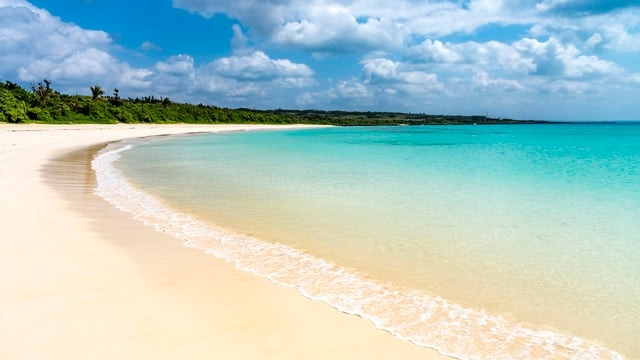 Wenn Sie vom Makiyama-Observatorium nach Südwesten fahren, ist der nächste Halt der Toguchi-Strand, einer der berühmtesten Naturstrände der Insel Irabu. Dieser atemberaubende Strand erstreckt sich über etwa 800 Meter und ist für seinen weichen, weißen Sand bekannt. Der allmähliche Farbübergang vom reinweißen Sand zum kobaltblauen Wasser sorgt für eine atemberaubende Aussicht, besonders an klaren Tagen, wenn die Inseln Miyako und Kurima in der Ferne zu sehen sind.