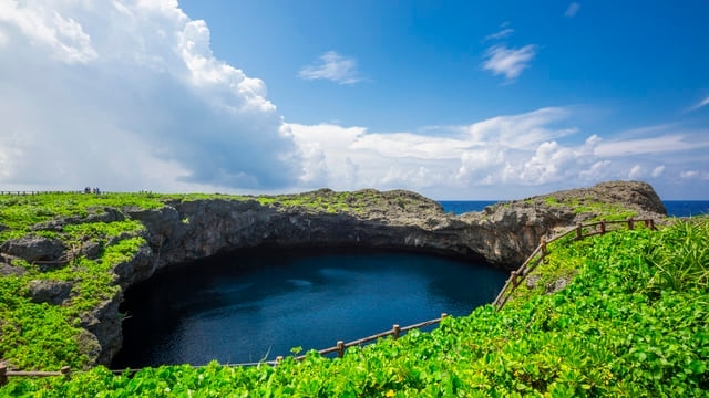Weiter entlang der Westküste führt die Route von der Insel Irabu zur Insel Shimoji, wo sich im südlichen Teil der Insel Shimoji der Toriike-Teich befindet. Dieser große Zwillingsteich ist berühmt für seine tiefe kobaltblaue Farbe und sein mystisches Aussehen. Der Bereich rund um den Teich ist gut gepflegt, mit Holzzäunen und Wegen, die es den Besuchern ermöglichen, die atemberaubende Naturlandschaft sicher zu genießen. Der Name „Toriike“ rührt daher, dass die beiden Teiche unterirdisch miteinander verbunden sind und so ein einzigartiges Naturphänomen schaffen.