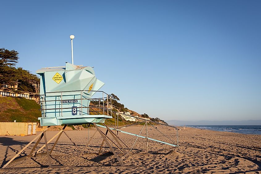 Blauer Rettungsschwimmerturm am Manresa State Beach, einem staatlich geschützten Strand an der Monterey Bay in der Nähe von Watsonville im Santa Cruz County, Kalifornien. Bildnachweis: bluestork / Shutterstock.com