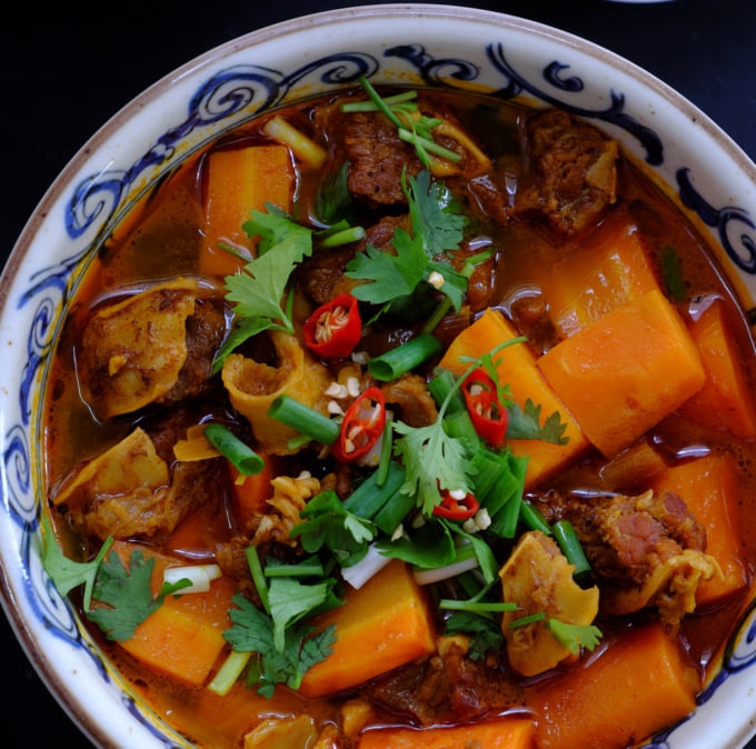 Bo Kho, ein weiteres kulinarisches Kind der französischen Besatzung, ist von den Rindfleischeintöpfen Frankreichs inspiriert, allerdings mit einer Prise vietnamesischem Geschmack. Die Brühe besteht im Allgemeinen aus geschmortem Rindfleisch, Karotten und Zwiebeln und wird meist mit Fünf-Gewürz-Fischsauce, Tomatenmark, Zitronengras und Kräutern verfeinert. Es ist ein weiteres Gericht, das Vietnam-Touristen häufig nicht auffällt, weshalb wir es gerne als unser köstliches kleines Geheimnis betrachten. Wie Sie es von einem französisch inspirierten Gericht erwarten können, wird es normalerweise mit einer Beilage Baguette serviert, in die Sie die köstliche Sauce eintauchen und aufsaugen können.