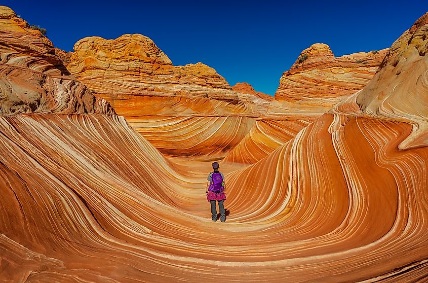 Ein Reisender, der The Wave, Arizona, erkundet.