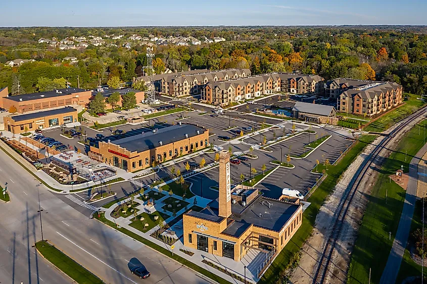Luftaufnahme des Gewerbe- und Wohngebiets Spur 16 in Mequon, Wisconsin, USA. Bildnachweis: James Meyer / Shutterstock.com