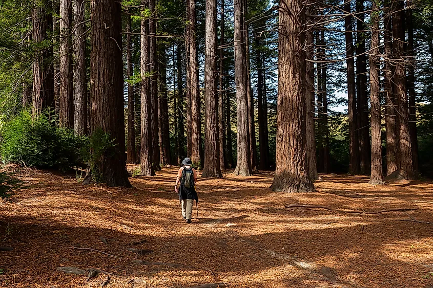 Mann beim Wandern in den Redwood-Wäldern des Te Mata Park bei Havelock North, Neuseeland.
