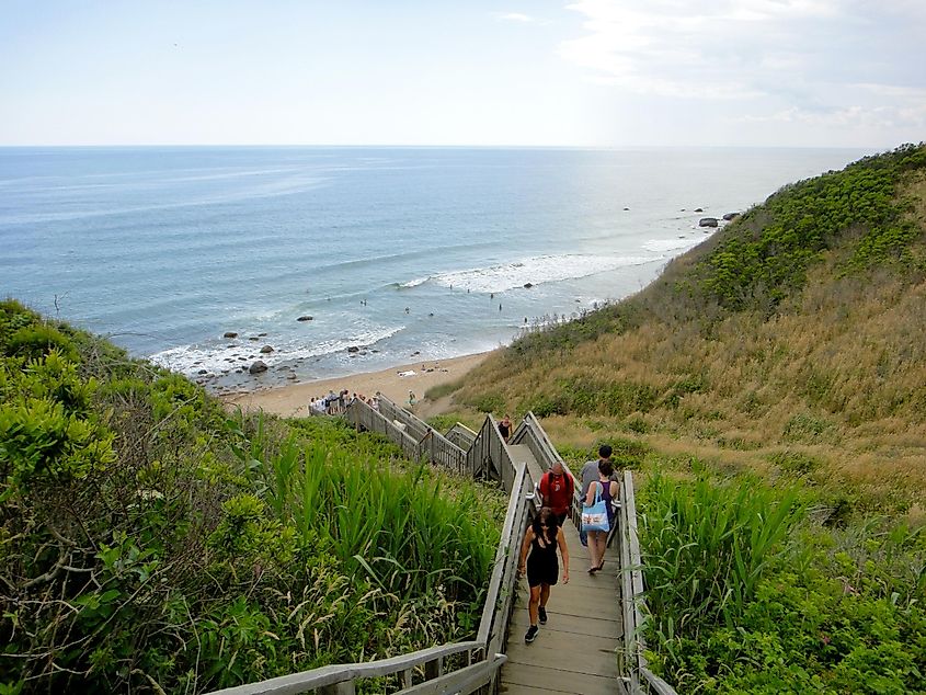 Treppen führen zu den Mohegan Bluffs und zum Strand in New Shoreham, Rhode Island. Bildnachweis quiggyt4 über Shutterstock.