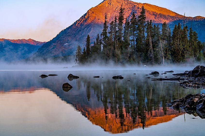 Sonnenaufgang über dem Lake Wenatchee in der Nähe von Leavenworth, Washington.